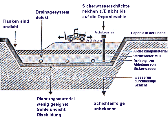 Mineralische Abdichtung aus Ton nach unten nur ca. 30 cm stark und beschädigt, auf wasserdurchlässigen Untergrund. Jährlich versickern etwa 1000 - 10 000 Kubikmeter giftbelastetes Sickerwasser aus der Deponie in den Untergrund. Genauere theoretische Berechnungen sind der GSB nicht möglich. Dies entspricht jährlich ca. 5000 bis 50 000 Badewannenfüllungen mit giftigem Deponiewasser.